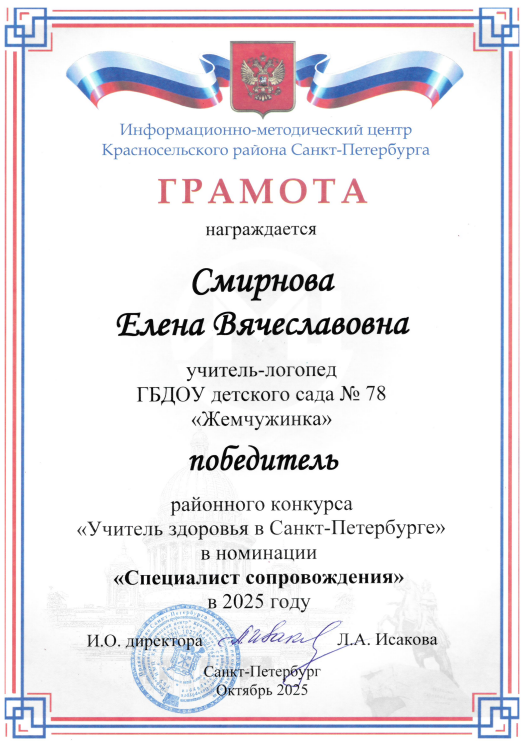 2 октября 2023 года на базе школы № 547 состоялась Торжественная церемония награждения педагогов Красносельского района Санкт-Петербурга ведомственными наградами Министерства Просвещения Российской Федерации. За многолетний добросовестный труд и значительные заслуги в сфере образования почетное звание «Почетный работник сферы образования Российской Федерации» было присвоено заместителю заведующего по воспитательно-образовательной работе Нефедовой Елене Борисовне.