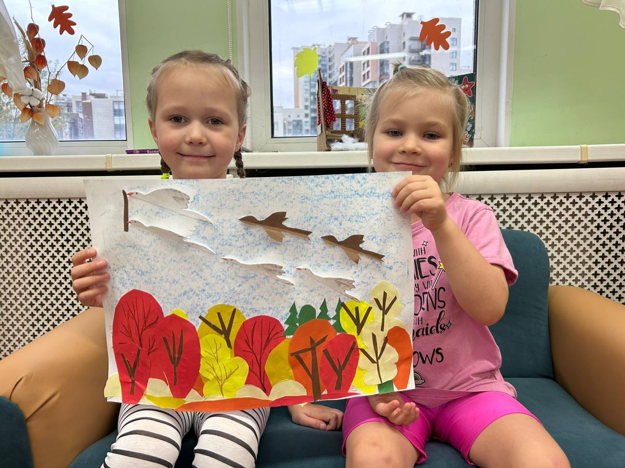 В первой половине октября также празднуется Всемирный день мигрирующих птиц. Воспитанники группы №15 «Крабики» вспомнили, каких птиц называют мигрирующими, как надолго они покидают родные места и как проходит их полет. Затем, вырезав необходимые детали для аппликации, сделали коллективную работу "В далекие края".