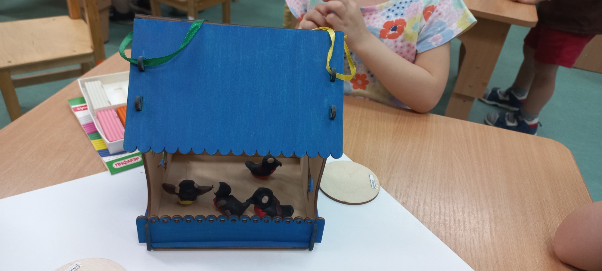 В рамках празднования Дня зимующих птиц с ребятами детского сада был проведён тематический день. Воспитанники ясельной группы №13 «Лягушата» совместно с воспитателями создали композицию.