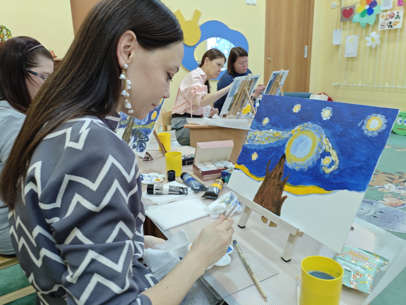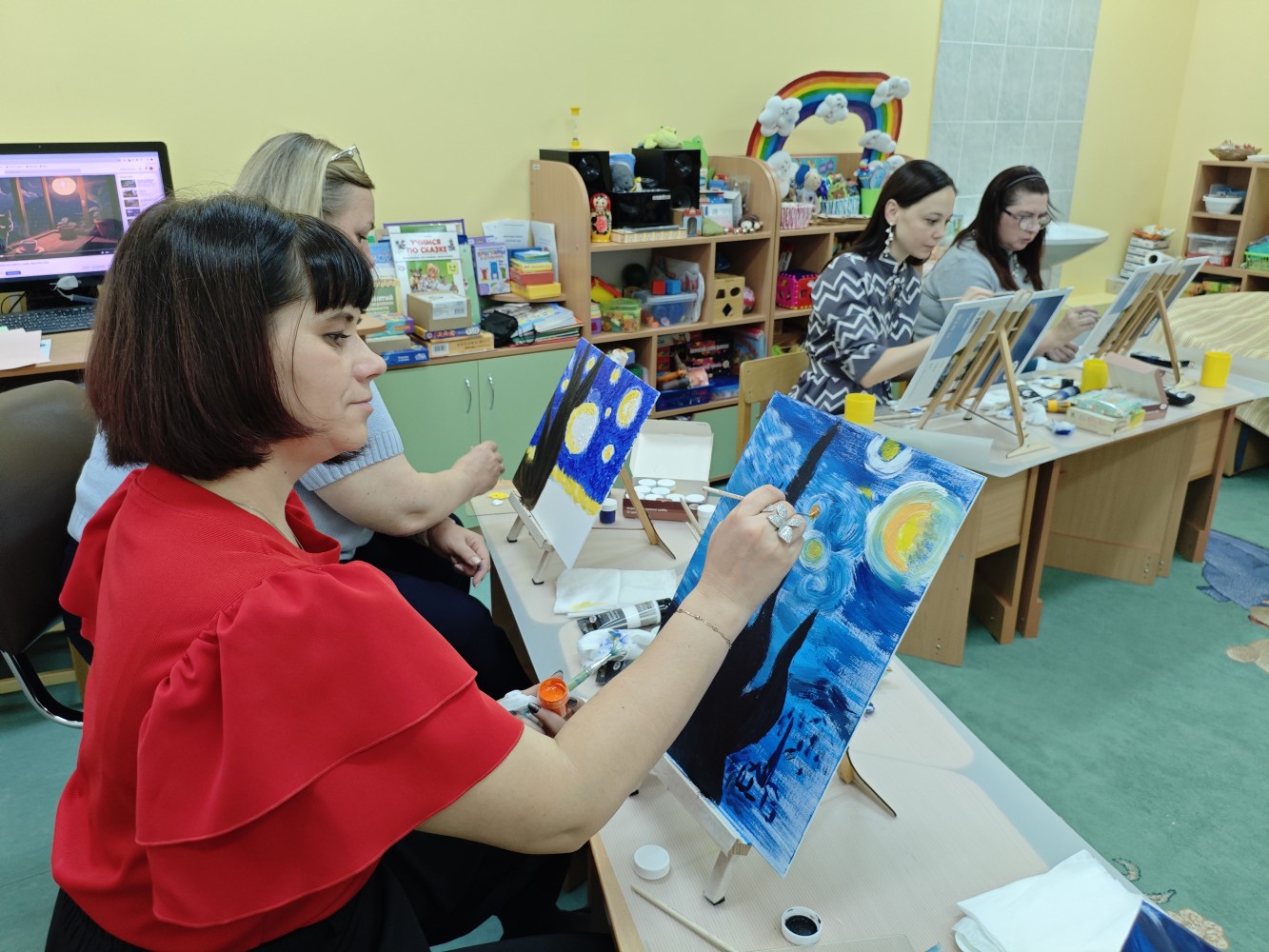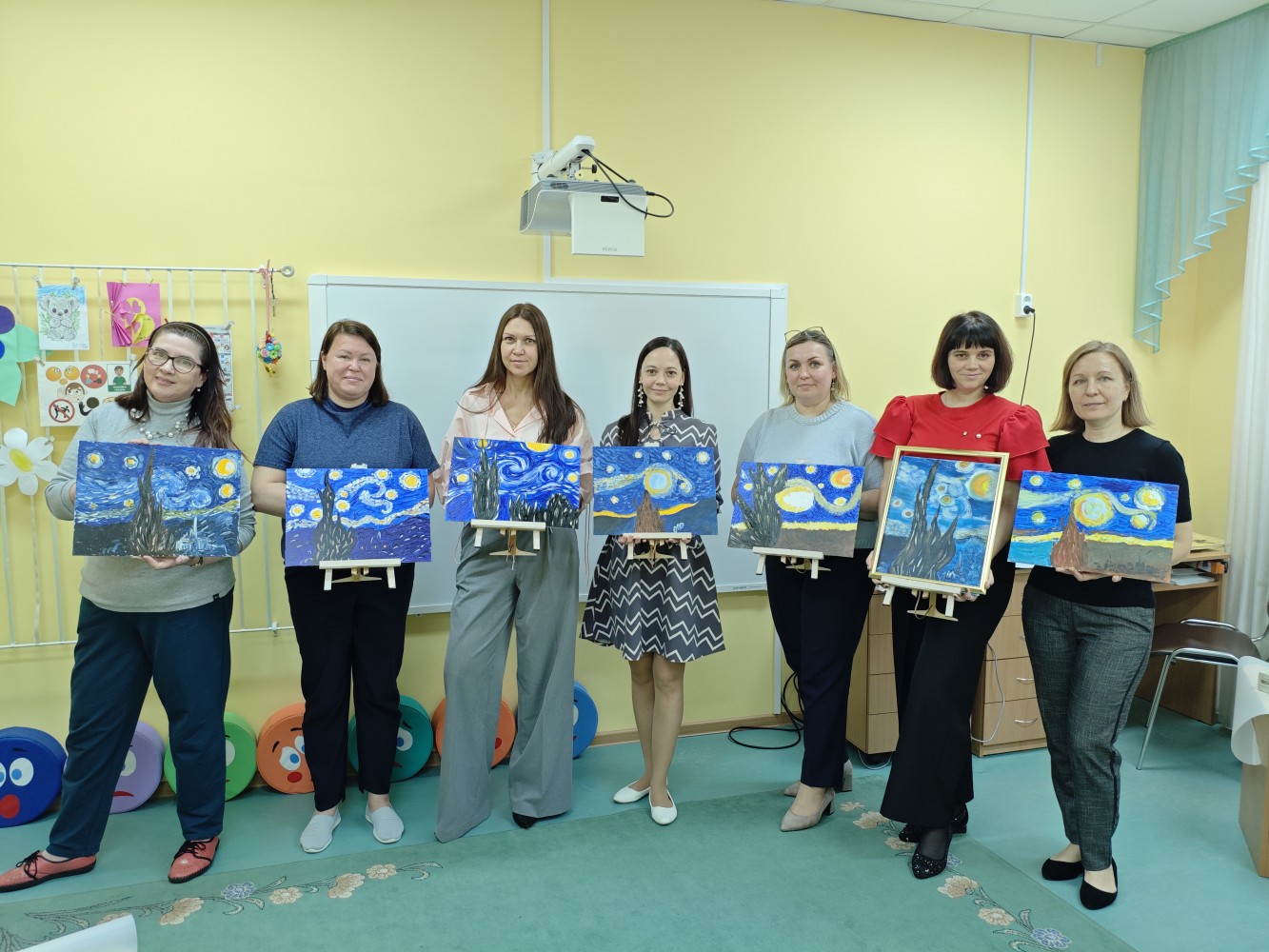 Психологическая гостиная «Ресурсная живопись «Звездная ночь» по мотивам В. Ван Гога» «Признаюсь, не знаю почему, но глядя на звёзды, мне всегда хочется мечтать…» В. Ван Гог 24 ноября 2025 года в рамках психолого-педагогической студии ТРЭК состоялось занятие в психологической гостиной «Ресурсная живопись», где участники прикоснулись к творчеству великого художника Винсента Ван Гога. Педагоги отметили динамику и «движение» в восприятии картины, яркость красок, загадочность и фантазийность композиции. С помощью интерактивной картины, созданной художником П. Вреллисом, участники погрузились в пространство звездного неба, что позволило актуализировать свои творческие способности. Итогом встречи стало создание собственной картины по мотивам «Звездная ночь».